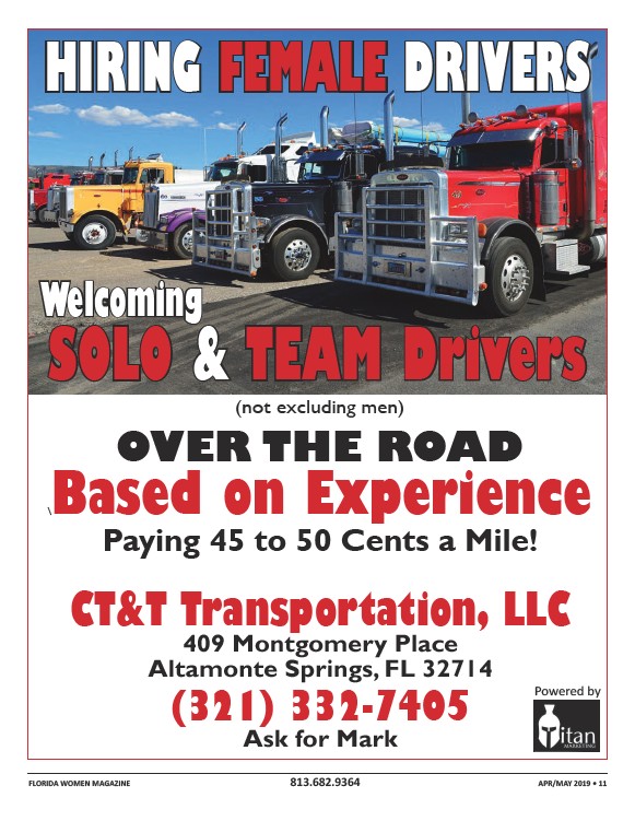 (not excluding men) OVER THE ROAD \ Paying 45 to 50 Cents a Mile! 409 Montgomery Place Altamonte Springs, FL 32714 Ask for Mark Powered by FLORIDA WOMEN MAGAZINE 813.682.9364 APR/MAY 2019 • 11